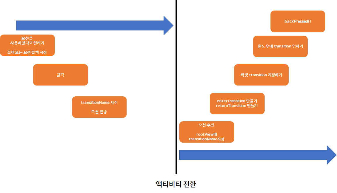 트랜지션은 window에서 그려지게 되니, window.sharedElmentEnterTransition과 sharedElementReturnTransition을 지정해서, enter와 return으로 분리된다는 사실을 명시하자.